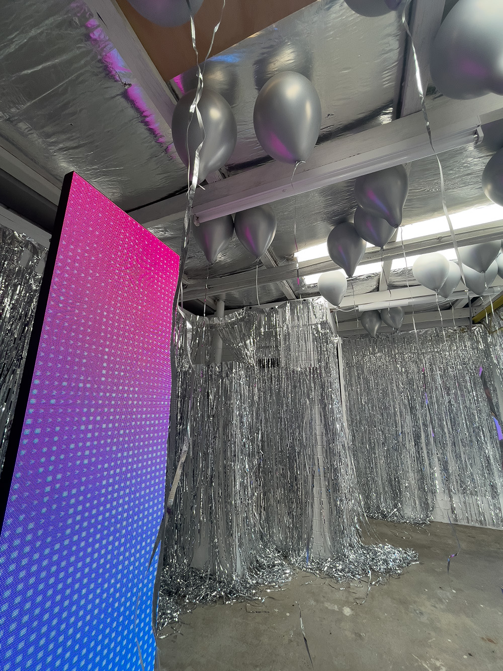Performance, mixed media painting, PLA thermoplastic, LED lights, 3d printed thermoplastic, disco balls, incense, helium balloons, looped MP4, LED display, sound, NFT Total size approx. 4 x 5m | 13 x 13ft Metadata: Collaborative digital combine with performance as object. Photography: The Artist and The Wandering Room |