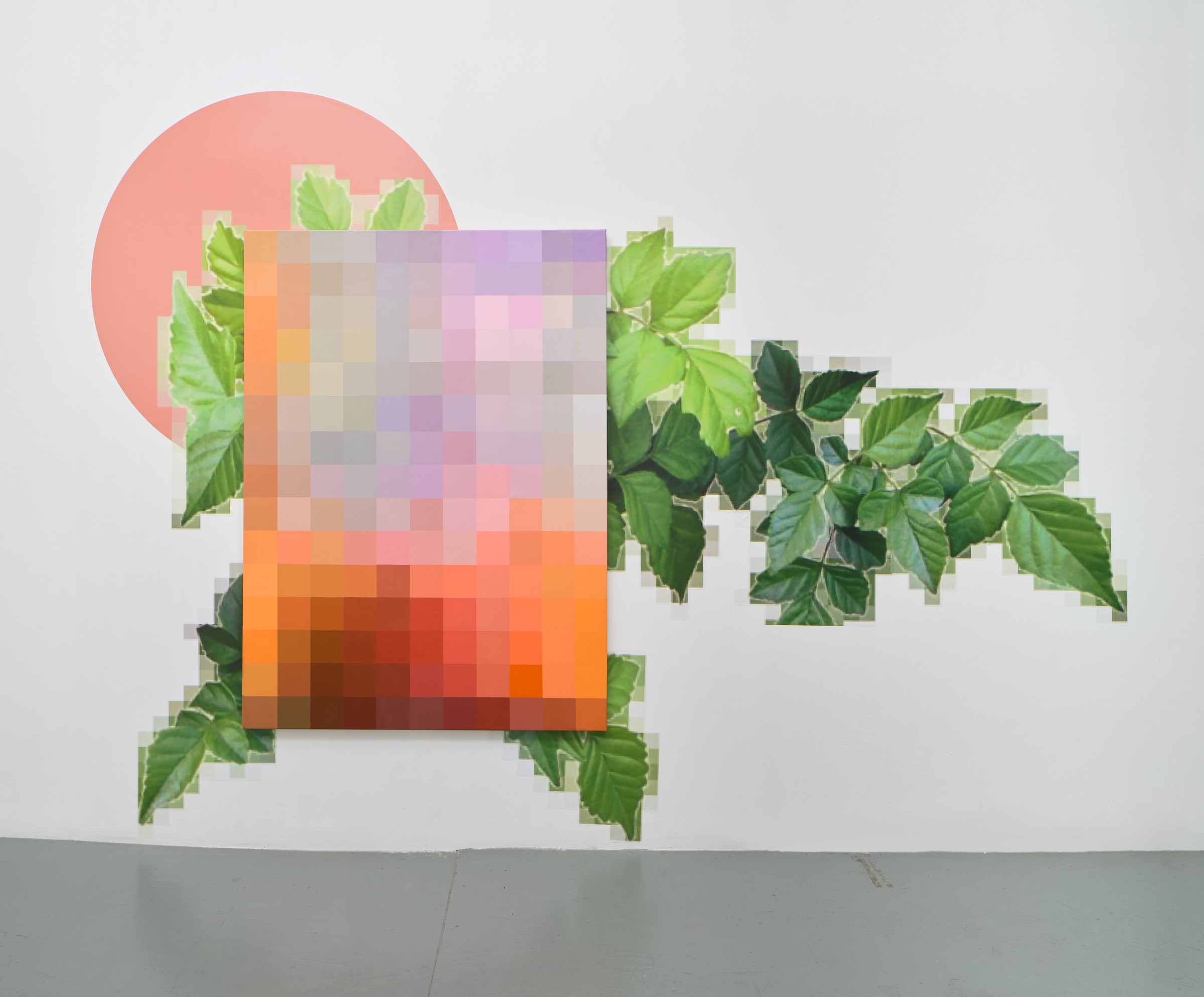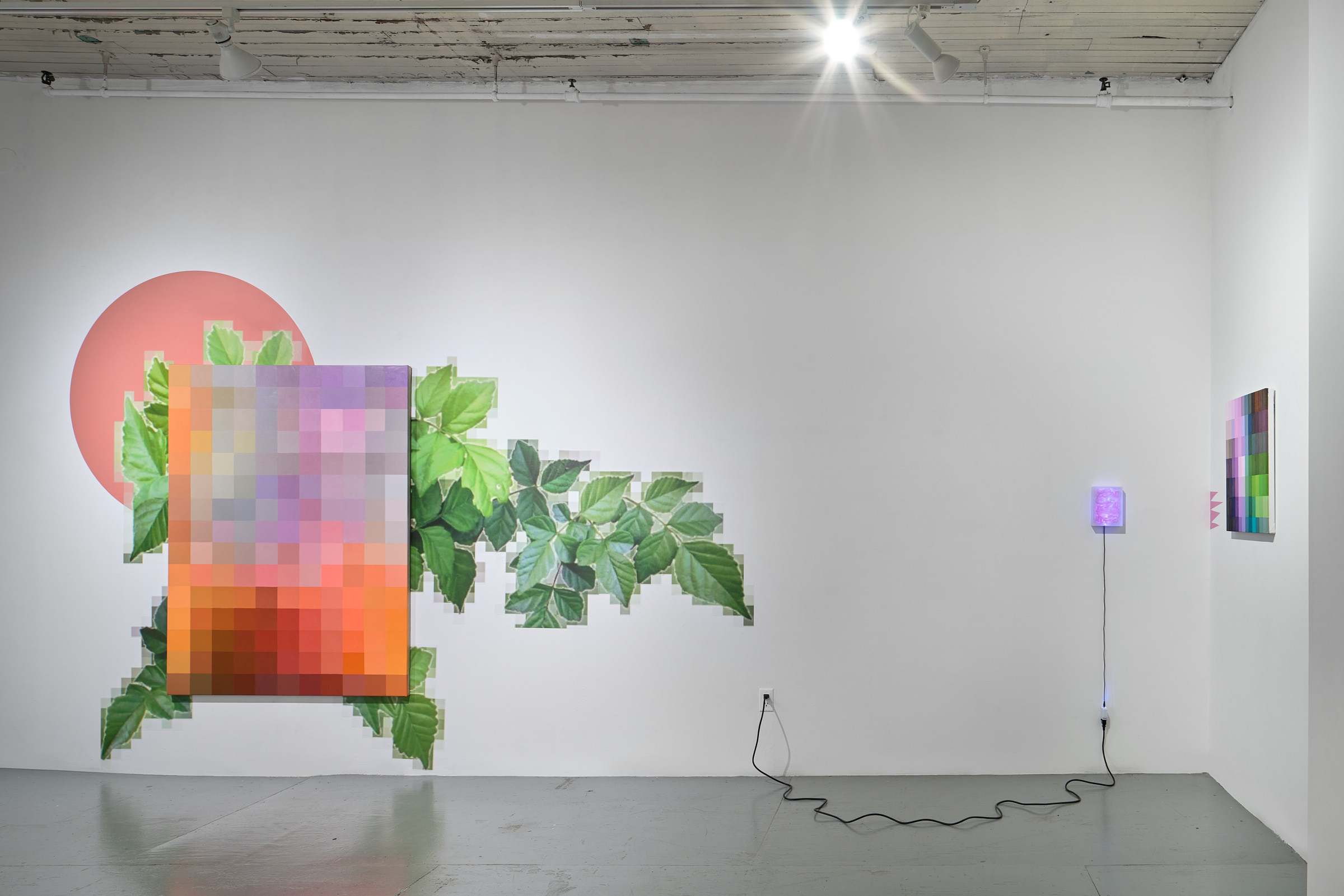 Painting: ♥‿♥, 2025 Synthetic polymer on linen 48 x 66” Photography: Brad Farwell ![]() Synthetic polymer on canvas, wall decal, 3D printed PLA thermoplastic, LED lights