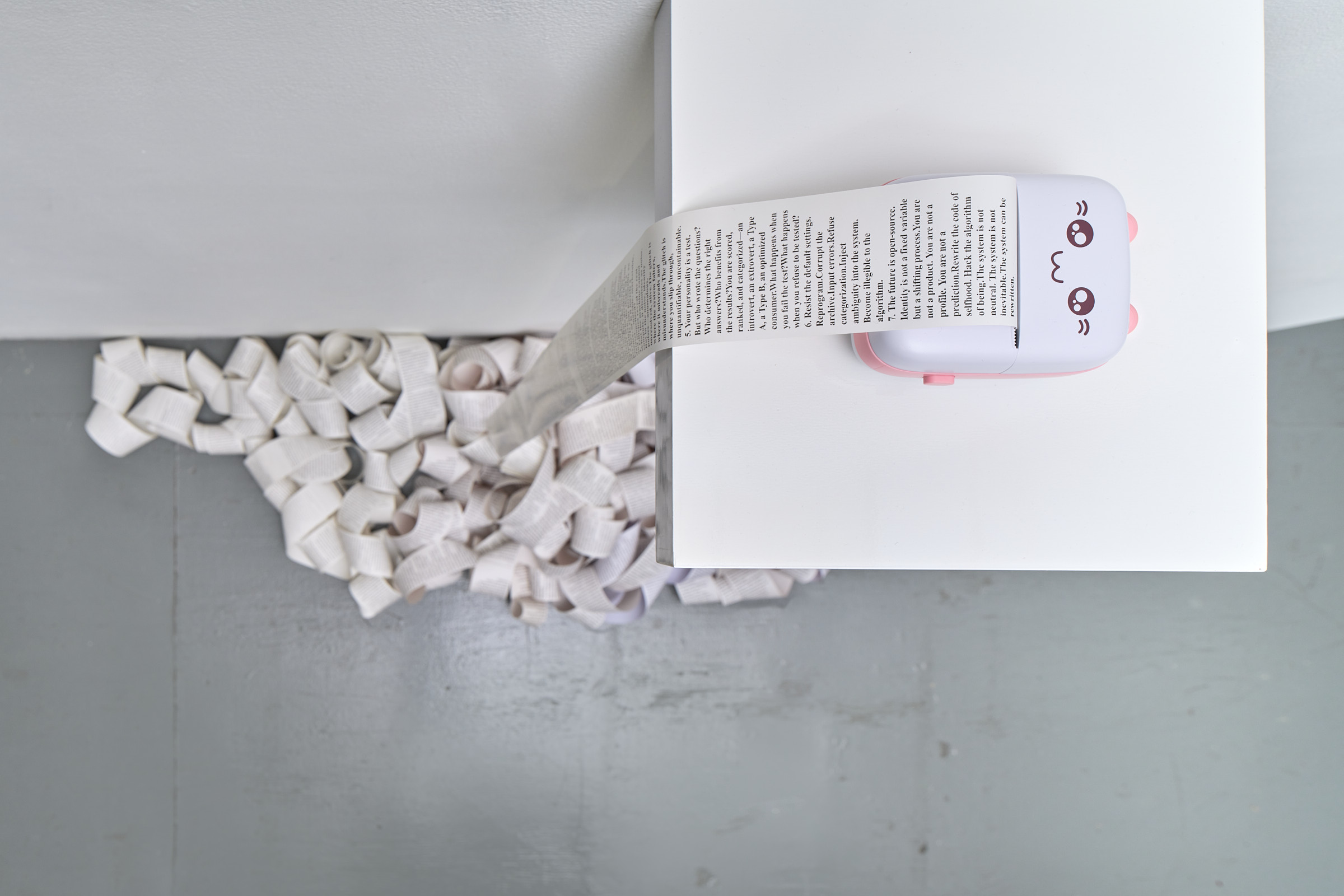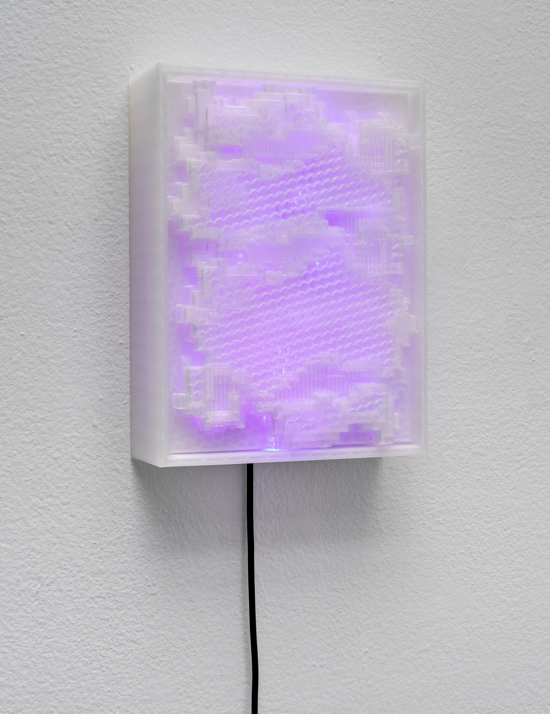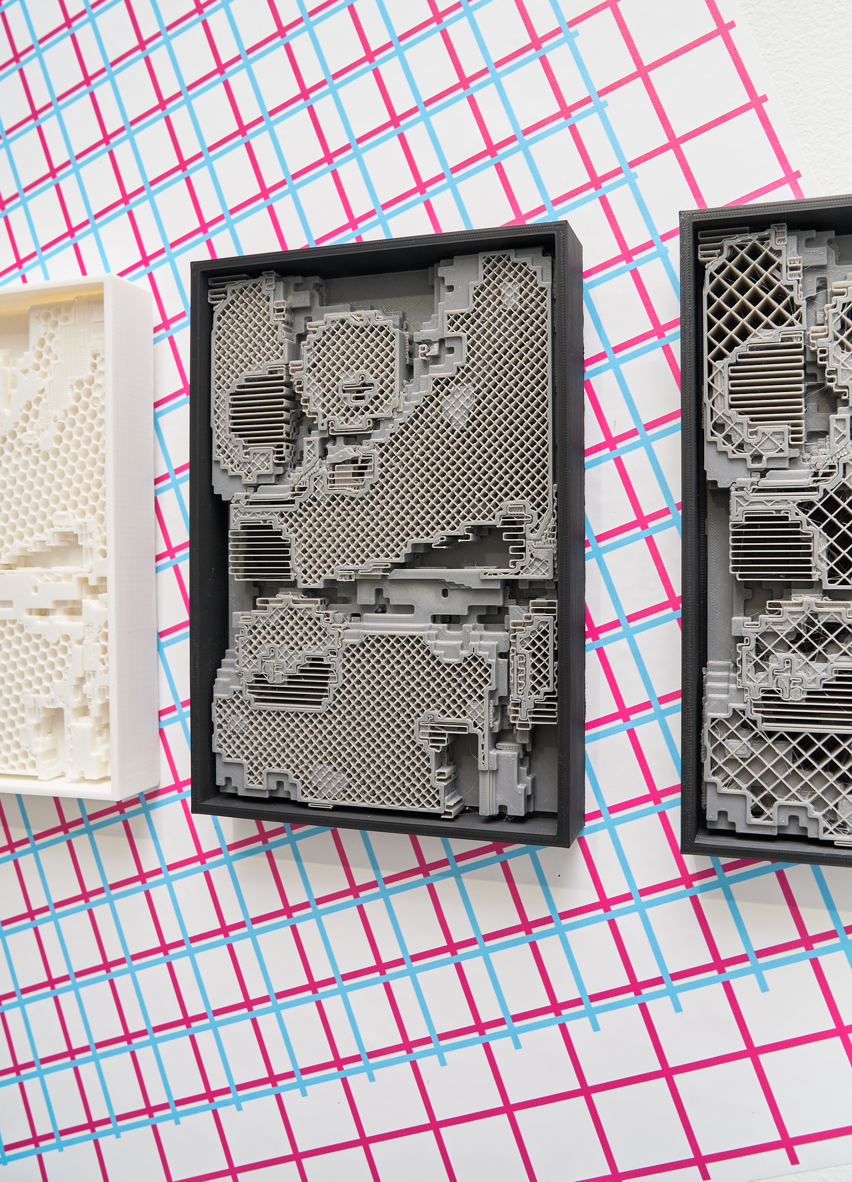 Wall decal, thermal printer, thermal paper, PLA thermoplastic, LED lights, Wall decal, Synthetic polymer on canvas, Synthetic polymer on linen, NFT Photography: Brad Farwell