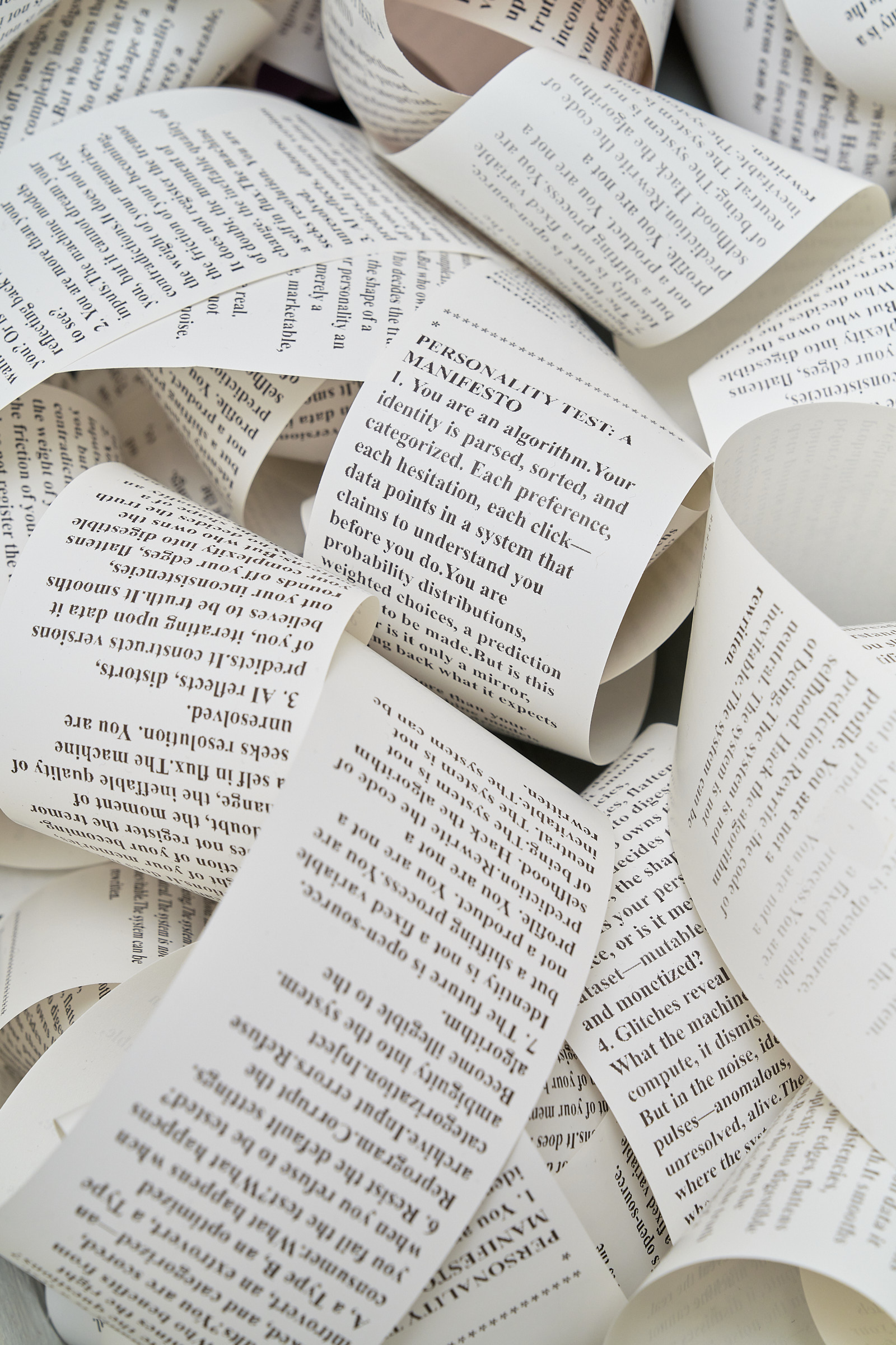Personality Test is an exhibition exploring identity through fact, fiction, and the lens of AI. Who wrote the questions? Who determines the right answers? Who benefits from the results? You are scored, ranked, and categorized—an introvert, an extrovert, a Type A, a Type B, an optimized consumer. What happens when you fail the test?What happens when you refuse to be tested? Personality Test: An Autofiction NARS Foundation May 30 - June 17, 2025 Essay here NFT here