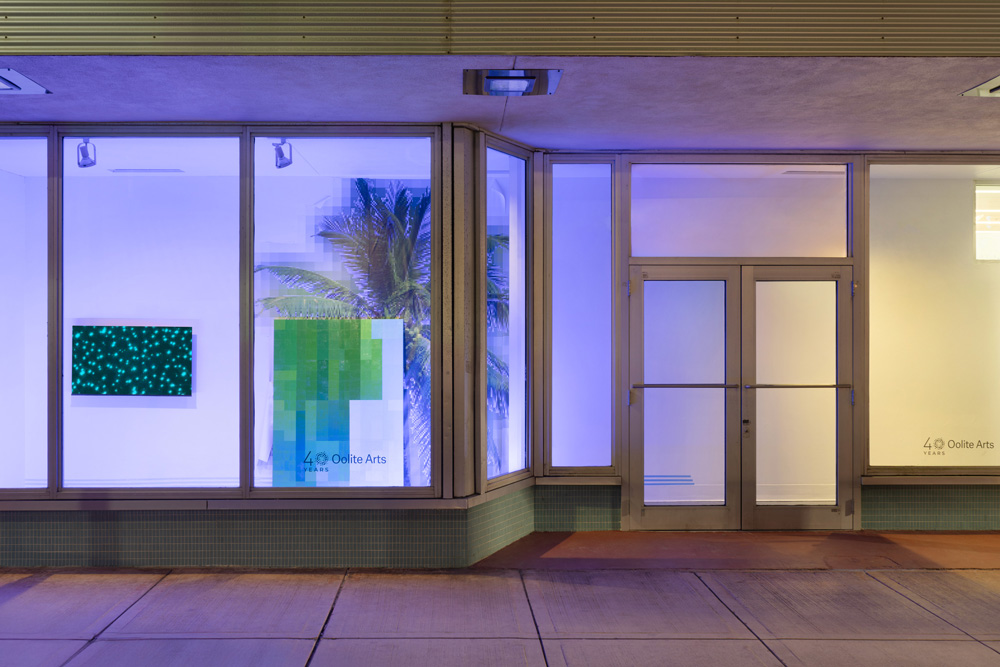 | // Digital Combine 16 This intermedial installation captures the artist's first impressions of Miami Beach through a convergence of digital video, wall decals, painting, 3D printing, window decals, and electronics. The work explores the ontological relationships between these diverse mediums, examining how different materials and technologies interact to construct meaning and experience.
