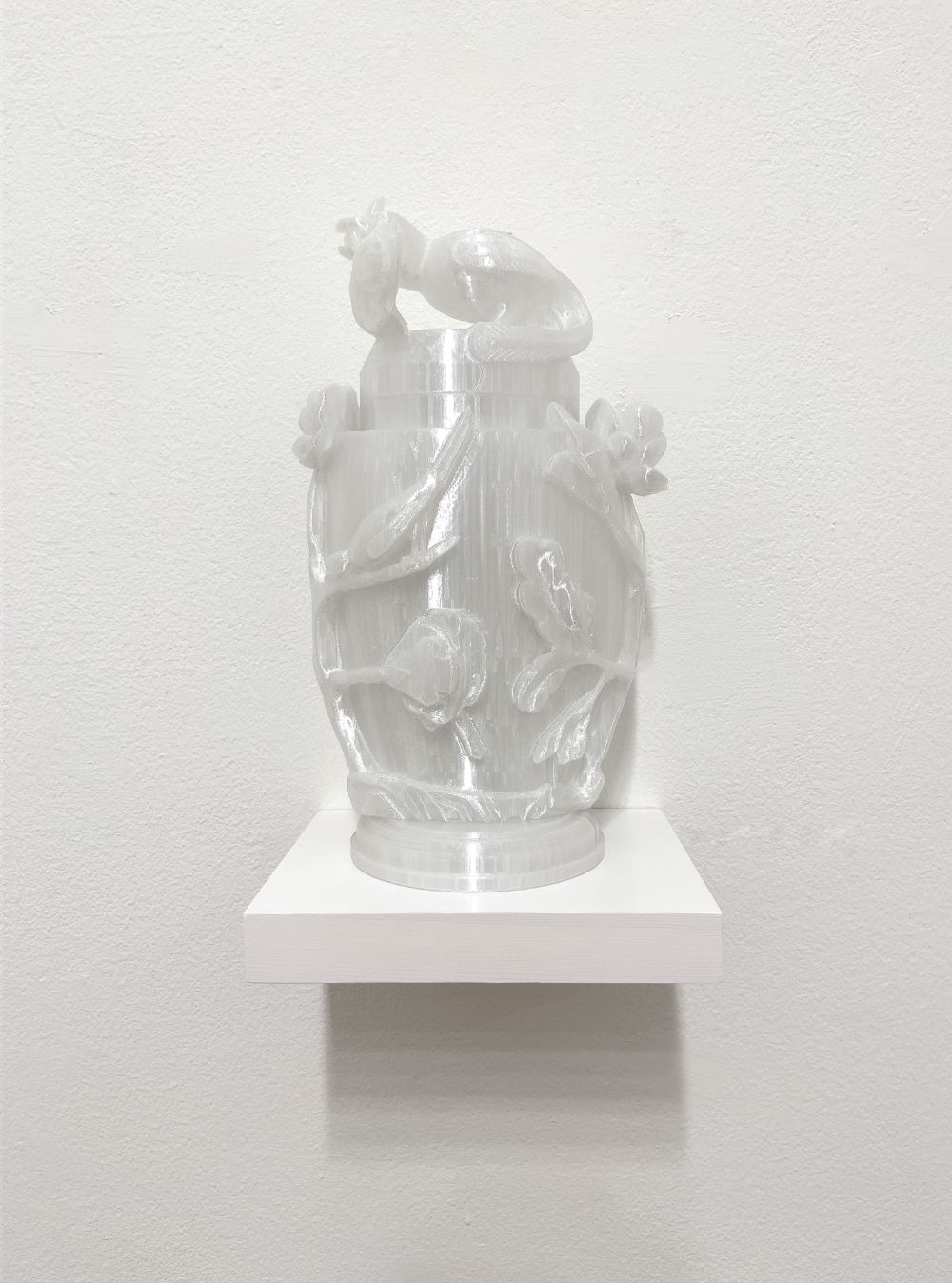 | // NEW MEDIA Dust is a printed 3D printed model based on a fictional artefact: the 'Urn of Urnachi', from Indiana Jones and the Temple of Doom (1984). Rather than holding sacred remains, the urn contains vacuum dust collected from a domestic interior in South Beach, Miami, during 2025. The work uses material residue as a proxy for lived experience.