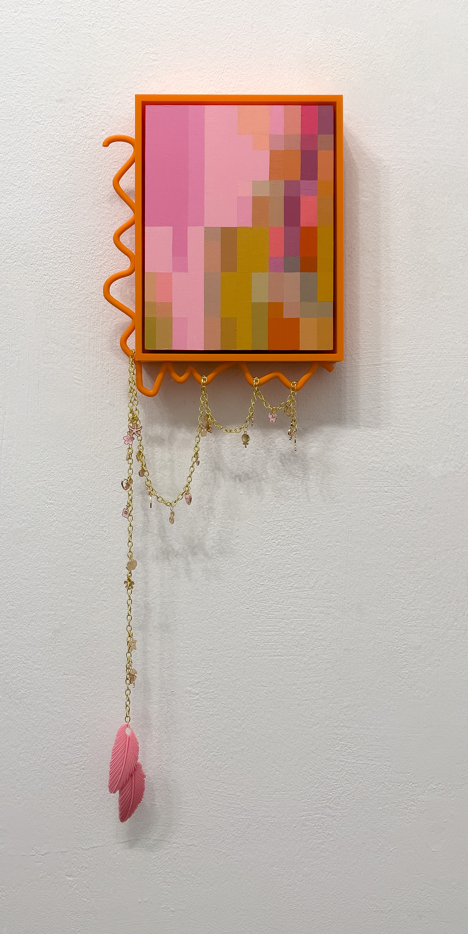 Acrylic on board, 3d printed PLA thermoplastic, gold chain, charms 26.5 x 75cm | 10.5 x 30in