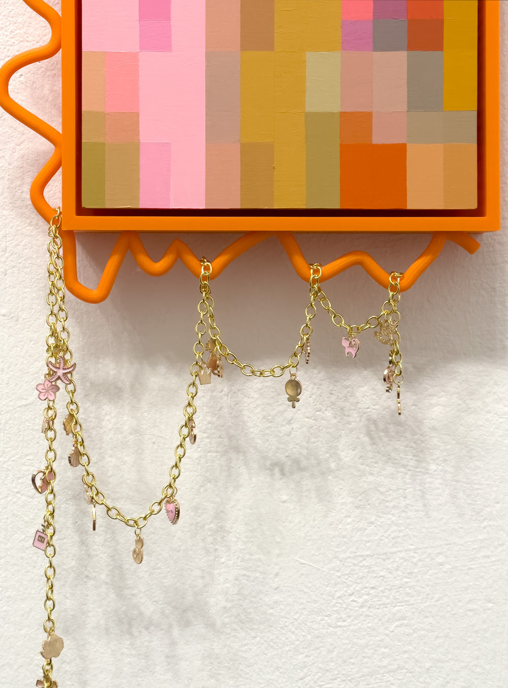 Acrylic on board, 3d printed PLA thermoplastic, gold chain, charms 26.5 x 75cm | 10.5 x 30in |